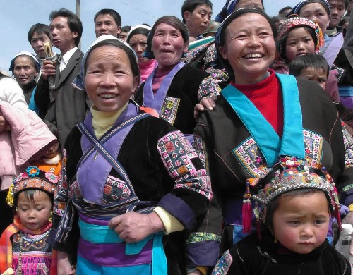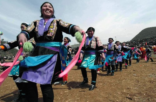 3月5日,在贵州省开阳县高寨苗族布依族乡平寨村苗族同胞的“斗牛节”上,苗族群众正在“跳园”。