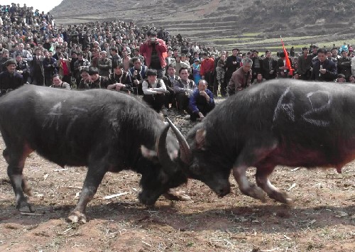 3月5日,在贵州省开阳县高寨苗族布依族乡平寨村苗族同胞的“斗牛节”上,两头水牛正斗得难解难分。