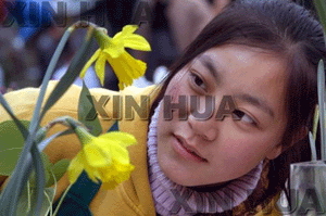 一个年轻女孩在贵阳钢厂花市欣赏欧洲水仙花