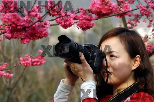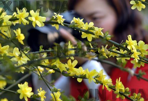 一位游客在贵阳市花溪河畔拍摄迎春花