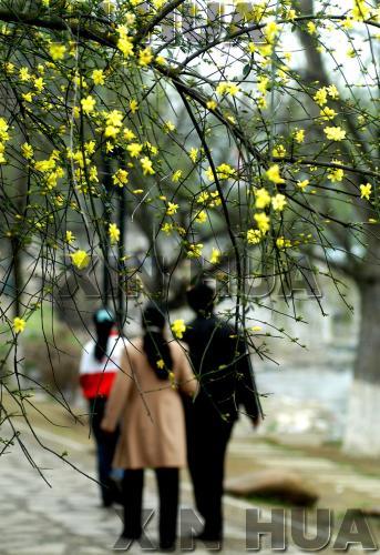 市民在贵阳市花溪平桥迎春花盛开的小径上散步