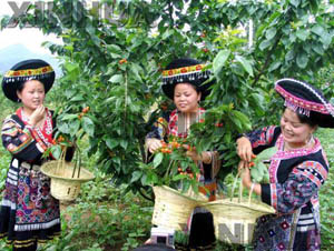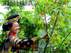 图为贵阳市下坝乡岩山村的苗族同胞正在采摘成熟了的樱桃