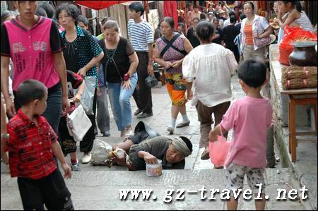 在高坡凉爽的气候和优美的田园风光让客人赞叹不已。可来到青岩,由于是周末,从贵阳自驾车来游玩的很多,堵车就堵了一个多小时。进入古镇,景象就更让人大跌眼镜了。原本狭窄的石板老街上人山人海,沿街的人家把房屋变成了经营的门面,摊贩们的遮阳布占据了狭小的街道上空,把原有的古建筑遮挡得严严实实,严重的影响了古镇的景观。垃圾、牛粪遍地,就像进入了一个农村的乡场。还有乞讨的横躺在狭小石板路上,游客们是纷纷的避让。这些景象让两位广东游客只走了百米就要求离开,逃离这个脏乱差的“大市场”。