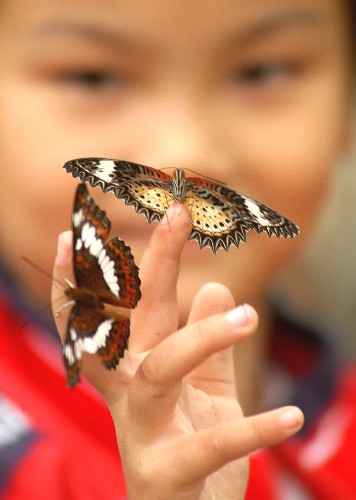 在贵阳大型活体蝴蝶科普展上,一名小女孩与蝴蝶嬉戏。