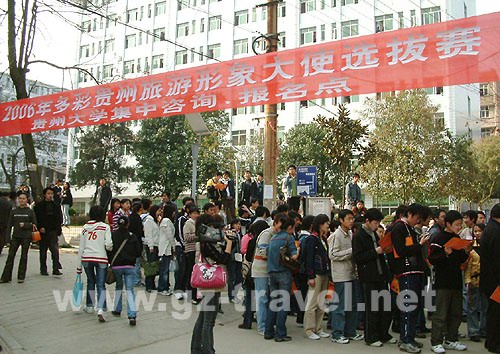 在贵州省团委的组织安排下,“国酒茅台”杯2006多彩贵州旅游形象大使选拔大赛花溪赛区咨询、报名活动在贵州大学校园学生宿舍楼旁拉开帷幕。接到大赛组委会的通知,在大赛组委会负责人的带领下,各新闻媒体单位一行二十余人准时于3月9日下午3点从贵州省团委出发,进行对此次活动的采访宣传。