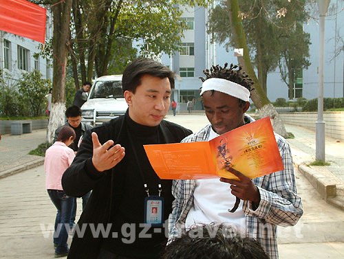 贵州独特的气候,希望通过大赛展示自己的汉语水平。(图为艾歌正在了解大赛报名事宜)