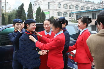 甜美的微笑,优雅的体态,25岁的邓莹是公司精品航线“云鹤”乘务组的队长,也是整个公司乘务队的骄傲。她不仅是2004年中国小姐风采大赛贵州赛区的冠军,并在去年国际航空小姐大赛中,代表公司赢得了最佳形体奖和最具智慧奖。