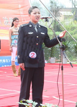 身着警察制服的蔡仁杰是修文赛区决赛现场最“抢眼”的选手之一。在比赛中,蔡仁杰选择了《说唱脸谱》这一颇有气势的歌曲,“选择这首歌就是因为它能体现警察的气势”。而她淋漓尽致的演绎,也赢得了观众的认可。
