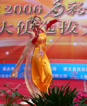 波光粼粼的梨花湖、沁人心脾的梨花香,游行在骑牛赏花、玩鸟斗鸡、扭扁担、梨园“认亲”、民间花灯表演、地方特色小吃的特色活动中……“国酒茅台”杯2006多彩贵州旅游形象大使选拔大赛修文赛区决赛现场让你穿行在神奇而多彩的贵州山水之间,领略着贵州的美山美水美景。经过11场初赛、2场复赛后,来自马家桥小学的老师张新以一段《梨花舞》技压群芳,当选为修文的梨花仙子(图)。