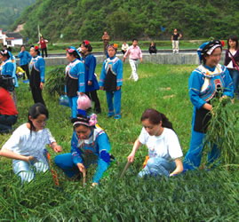 经过近一个小时的联欢,10名形象大使还拿起了镰刀和锄头走进了田间地头,与当地的村民们一起劳动,体验“社会主义新农村”的生活,在田间割草的时候,大使们还与当地能歌善舞的布依族村民对起了山歌。其中一名叫吴晓洁的大使告诉记者,香纸沟的风光很美,如果她能当选多彩贵州旅游形象大使,她一定要通过自己将贵州类似香纸沟这样的美丽地方推介出去,让更多人知道家乡的美丽。