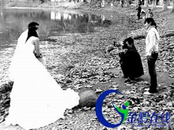 周末,省城天气雨止温升,笔者在贵阳花溪黄金大道看见,多对新人聚集在有“中国第一爱河”之称的花溪河畔,拍摄婚纱照,制作mtv,将自己一生中最幸福最浪漫的时刻定格在记忆里,成为景区一道独特的风景。据几名专门拍摄婚纱照的摄影师介绍,近年来,贵阳花溪的黄金大道等地已经成为著名的婚纱摄影外景基地,一到秋冬季节,贵阳不少结婚的新人都到黄金大道摄影摄像。“爱河”的文化内涵给新人的美满姻缘增添了新的浪漫,而新人的出现又给“爱河”增添了新的人文风景。
