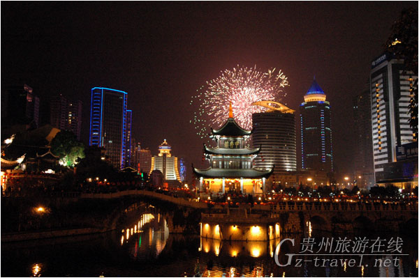 本站讯 “劈里啪啦……”随着2007年2月18日零时农历正月初一新年钟声的敲响,在甲秀楼附近等待观看焰火的市民顿时炸开了花,整个现场像拉开了欢乐的闸。色彩各异、造型优美的烟花在贵阳市人民广场的上空130米至240米之间绽放,筑城的夜空变得炫目璀璨。