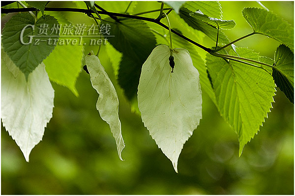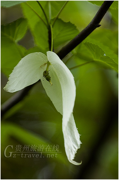 珙桐,又名鸽子树,属落叶乔木,是我国特有的珍稀植物,分布于贵州、四川、云南等地。树高15—20米,叶片广卵形,初夏开花。珙桐花由多数雄花与一朵两性花组成顶生的圆形头状花序,宛如一个长着“眼睛”和“嘴巴”的鸽子脑袋,花序基部两片大而洁白的苞片,则像是白鸽的一对翅膀。4~5月间,盛开的珙桐花,象一张张白色的苞片在绿叶丛中浮动,有如千万只白鸽栖息在树梢枝头,振翅欲飞。