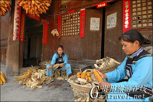 水头寨的布依族妇女正在剥玉米皮