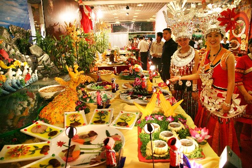 当日,苗族姑娘在美食博览会上介绍“多彩贵州风情宴”特色菜。