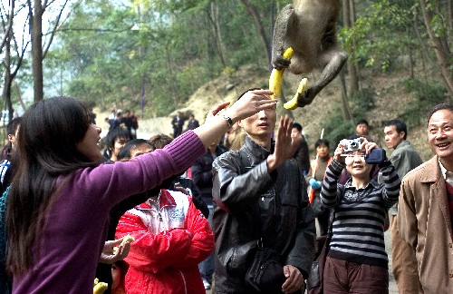 贵阳市的黔灵公园里,生活着几百只野生猕猴。贵阳市民常常利用休息时间来给它们喂食,慕名而来的游客会被这些机灵的猕猴所吸引并与它们合影留念。这群贵阳市民特殊的“邻居”在自己的“公寓内”自由地繁衍生息,玩耍嬉戏,给人们带来了无尽的乐趣。人与猕猴和谐相处,成为贵阳一道独特的风景。