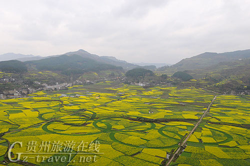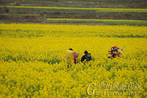 开阳禾丰乡青龙河龙滩坝利用农作物种植出的奥运五环标志“背包”在花海中徒步留影