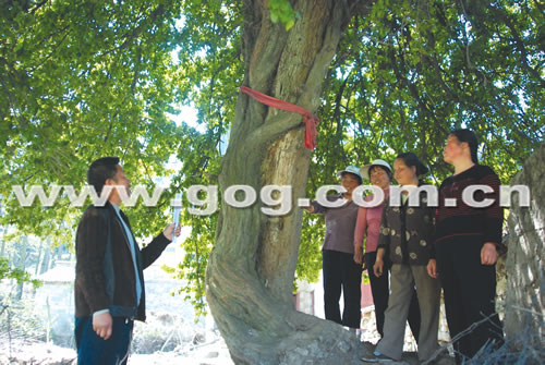 修文县久长镇上寨村有棵10多米高的古树。这棵被当地村民称为“夫妻树”的大树,由一棵小叶黄杨树紧紧抱着一棵大叶黄杨树合成一树,犹如一对夫妻紧紧拥抱。该树引来不少游客前来观赏。目前,上寨村正在围绕这棵树的保护进行生态文明村寨建设规划,将以这棵树为中心,修建一个供村民们活动的休闲文化广场。图为村民们正在商讨古树保护的具体方案。