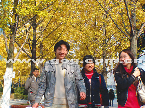 几名游客从贵阳迎宾大道遵义路人行道的银杏林中走过。林城入冬以来,城内的银杏梧桐树叶一片金黄,层林浸染景致迷人。
