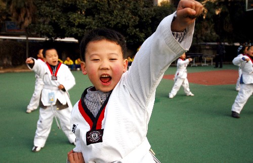 12月25日,在贵阳市实验二中举行的学校体育场馆对公众开放仪式上,学生们进行跆拳道表演。
