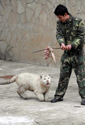2月17日,在贵阳森林野生动物园,“银虎”正在向饲养员要食物
