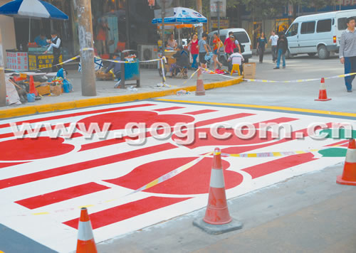 9月23日,贵阳市交警支队设施科的警官和施工人员,在富水北路小十字段铺设贵阳市首条彩色爱心斑马线。记者在现场看到,爱心斑马线整体图案由红色的斑马线、红绿两色心形图案以及象征林城贵阳、绿色家园和环保等多重含义的绿树组成。
