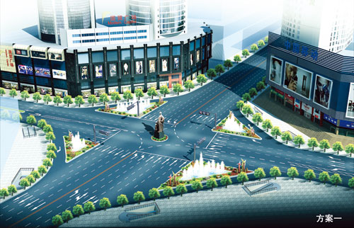 方案一:取消现有环岛,最大限度提高交通通行能力的同时增加城市文化内涵。改环岛交叉口为十字交叉口,在交叉口设置四个交通导流岛,扩宽交叉口车行道,增加右转车道;在交叉口设贵阳历史文化名人王阳明雕像,展现“知行合一、协力争先”的贵阳精神;导流岛内设喷泉小品和绿化,兼顾城市景观和“喷水池”历史传统。据初步测算,改造后交叉口通行能力可达8000—9000辆/小时。
