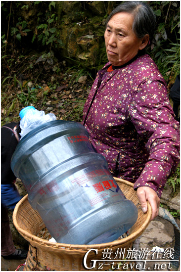 满载而归的背水人。老人已经70多岁,挑着这么多的水在山路上依然步履稳健。