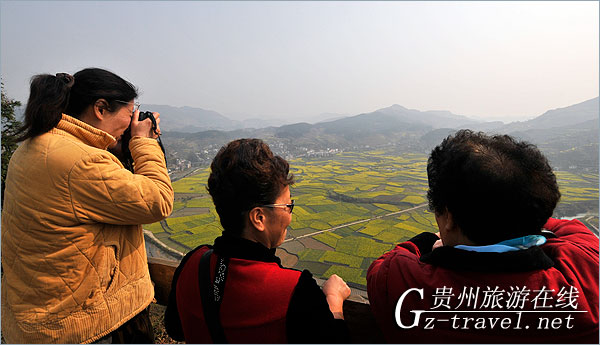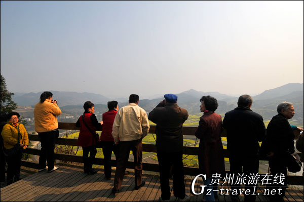 众多游客前来踏青。图为来自贵阳的游客在观景台上赏金灿灿的油菜花。