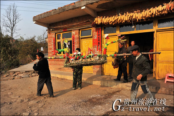 本网讯 近日,贵阳市花溪区举行民间祈福活动。黔陶乡的小马场寨是个布依族寨子,每年正月都要举行民间的祈福祭祀活动,祈求老天保佑风调雨顺,全寨平安吉祥!祭祀队伍由祭师带领,由两人抬着一条纸扎的龙随行。祭师手里提着一把稻草、一根树枝和一只公鸡。祭祀的队伍要走遍寨子每一户人家,所到之处,主人家都要准备好一碗(杯)酒和香、纸,随行人将香、纸放入龙之腹中,祭师便开始念祭词,用口将酒喷洒后,再到另一家。走完所有的人家后,将龙抬至河边化龙!杀鸡祭天后,将钱纸及龙点燃焚烧后,整个仪式便结束了!
