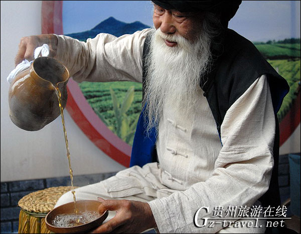 敬茶石阡县独有的“文火煮苔茶”表演石阡县汤山镇百岁老人杜江在冲泡苔茶