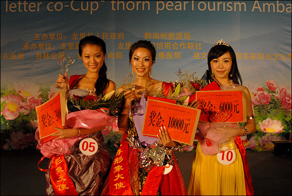 本报讯 2010年10月16日晚,由龙里县人民政府、黔南州旅游局主办、龙里县旅游局、龙里县农村信用合作联社承办的贵州•龙里“信合杯”刺梨花旅游形象大使决赛在龙里县兴龙广场举行,来自北京永信集团、贵州师范学院、贵州民族学院、贵阳小河开发区、贵州电视台、龙里县、中国计算机学院、贵州移商科投的15名选手经过亮相介绍、旅游知识、信合知识问答、才艺展示、晚装展示等几轮激烈角逐,最后,龙里县文化馆李丹丹以9.81分的成绩摘取桂冠,龙里广播电视台陈晓丽获得亚军,贵州民族学院梁罗巍获得季军。大赛还评出了最佳才艺奖、最佳气质奖、最佳上镜奖各一名。
