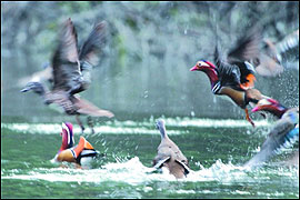 近日,记者在南江峡谷见到成双成对的鸳鸯正在清澈的水面上戏水。据南江峡谷风景区管理人员介绍,自南江峡谷注重生态保护以来,每年入冬后,许多鸟类都飞到峡谷越冬,已成为南江峡谷的冬季常住户。前一段时间,数百只野生鸳鸯飞来峡谷越冬,比去年冬季多出200余对,其它越冬鸟类的数量也在逐年增多。