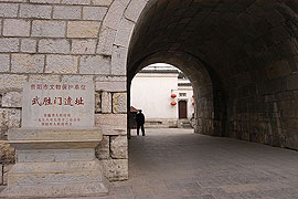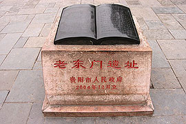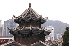 往前走一点是贵阳的文昌阁,它位于贵阳市城区东隅,始建于明万历二十四年(公 元1596年),占地1200平方米。文昌阁具有明显的明代建筑风格,坐东向西,高17.25 米,色调以青灰为主。文昌阁造型独特,其结构为三层三檐九角不等角攒尖顶。底层为四方,二、三层为九方。顶角的划分是将四周四等分后,再将正面(西面)一条弧三 等分,其余三条弧二等分。楼楞木二、三层各9根,层顶为9角,此外,柱54根,粱81 根,均为9的倍数,据考证这种结构在我国古建筑中别无二座。文昌阁虽属封建社会晚期建筑,但在一些建筑手法上却采取了早期的风格,内外均无华丽的装饰,翼角起角 较平缓,底层前檐柱头面阑额,柱上使用出两跳的插拱承托檐枋,拱头上卷刹四瓣, 梁头相叠处素面驼峰垫托,相当别致。