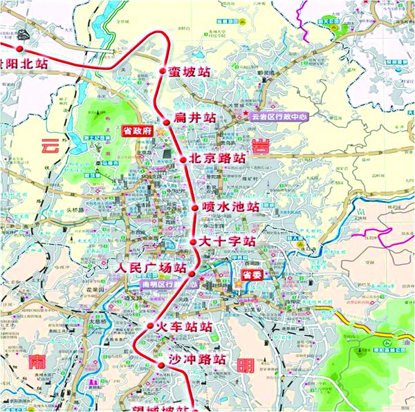 站点规划为:窦官—将军山—云潭路—金阳大道(绿色未来)—行政中心—会展中心—朱家湾—大寨—大关—火车北站—蛮坡—扁井—北京路—喷水池—人民广场—火车站—沙冲路—望城坡—新村—长江路—清水江路—周家寨。