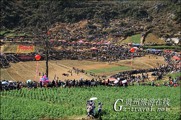 本网讯 2月27日,农历正月二十五,贵阳市开阳县高寨乡平寨苗族村举行一年一度的隆重斗牛大赛。附近十里八乡的苗族同胞近20000余人前来参观这一盛会。当日,晴空万里,平寨村斗牛场上人头攒动,斗牛场上,水牯牛的精彩角逐不时博得在场观众阵阵掌声,整个斗牛场欢声雷动,热闹非常。