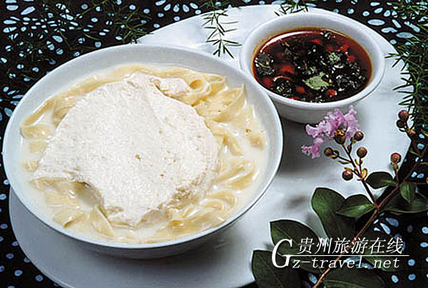 遵义豆花面是遵义人的一种独创。面条上盖着一团雪白的豆花,面条浸在豆浆之中。豆花,有的地方叫水豆腐,是用前一次点豆腐的窖水存放几天后成为酸汤。用这种酸汤点豆腐,使豆腐没有石膏或卤水的苦涩味,比一般豆腐细嫩,比豆腐脑紧扎。据说起源于清代光绪年间,开初是素面,是一行善人家专为来湘山寺烧香拜佛 的人开的,因而取利微薄,怎样才味美,不少人为此献计献方,到民国年间,已经发展成为正宗的遵义豆花面,生意兴隆。豆花面配料,吃法特殊。面条是上等面加适量土碱,用手工反复揉拉,做成薄而透的宽面 条,下锅后煮熟不软不硬,以豆浆为汤,上盖嫩豆花,另加辣椒水一碟,辣椒水有讲究,有素、荤两种,素椒配有五种保密的佐料,荤椒还配有瘦肉丁、鸡肉丁、花生米、豆腐皮、金钩等,其味鲜美,将豆花与面挑入辣椒碟中吃。