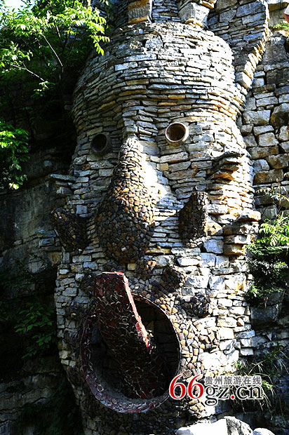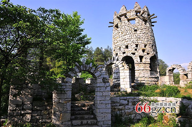 夜郎谷既是夜郎古国的一种浓缩再现,又是石林艺术文化融为一体的自然生态的幽雅融合。青石堆就的城门在阳光下散发出冷静的光芒,青藤爬满其上,犹如为时空画下一个大大的句号,城门内树木层层叠叠,近处尚能分辨出树与树之间与青天浑然一体,令人分不清究竟是天染亮了这片绿色,还是苍林染碧了青天。石柱、石板画、石茅屋、石古堡、石桥、石路、石长城等等,都能淋漓尽致地展示出古夜郎国时期的文化艺术。