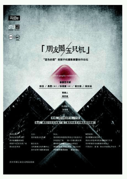 本次手机影展是由福贵文化传媒主办,当代影像文化传播中心、贵州省青年摄影家协会联合主办,省摄协、贵大艺术学院、贵州旅游在线协办,贵州中烟特别支持。参展艺术家分别为:当代贵州影像研究室主任彭浩、贵大艺术学院教师易雯(女)、平面设计师徐境黛(女)、贵州旅游在线网站长谢志强、艺术学院摄影教研室主任杨安迪,共五人组成,故称“五只机”。