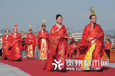 “关关雎鸠,在河之洲。窈窕淑女,君子好逑……”昨日上午10时,悠扬的汉唐乐响起,贵阳孔学堂大成殿前,“赞者”(司仪)手持玉帛,咏唱着《诗经》名篇《关雎》。由“侍卫”和“宫女”开道,36对新人身穿华丽汉服,牵着红绸缎,缓缓步入孔学堂广场,一场充满浓厚中华文化氛围的汉唐集体婚礼拉开帷幕。