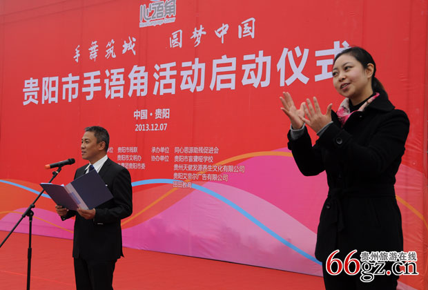 此次活动由贵阳市残联、贵阳市文明办、团市委主办。亲临启动仪式的领导及嘉宾有贵阳市残联党委书记、理事长曹晓明、贵阳市文明办副主任佘崇忠、共青团贵阳市委副书记杨鹏等十余位。曹晓明表示:希望通过大家的努力,让健听人和聋哑人之间的沟通多一点,隔阂甚至误会少一点,让聋哑人不再孤独。