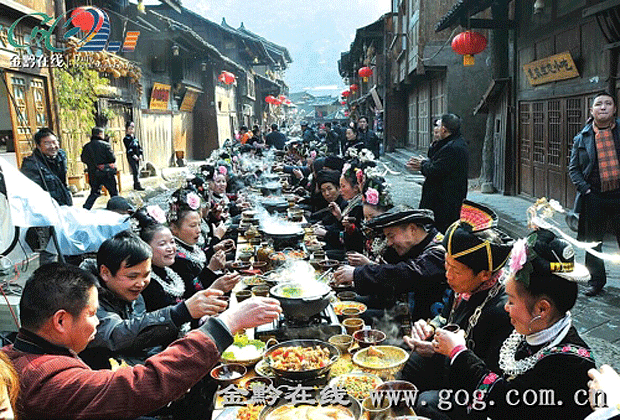 雷山县西江苗家长桌宴的来历:在雷山西江苗寨,寨边有多处风雨桥,这种古建筑兴于汉末至唐代,建筑结构严谨,造型独特,极富民族特色。风雨桥跨河而建,有廊有亭,既可行人,又可憩息避风雨。当苗寨接待很多客人时,热情的苗家就会在风雨桥上摆上一长串桌子、凳子,将饭菜一碗碗摆放上来,宾客一起在这热烈、欢乐的长桌宴席间,一边品尝苗家美食,一边喝酒、唱歌、跳舞,其乐融融。