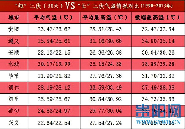 2014年从7月18日开始入伏,贵州与全国同步进入“三伏”天气。受“威马逊”外围云系的影响,7月20日省内部分地区留下了雨水的“足迹”。省气象台预计,“威马逊”的影响继续减弱,从22日开始至24日,赤水河谷及省的东部地区高温范围逐步扩大。从数据看来,遵义、铜仁、凯里是有些热,最高温能上30℃,但其他地方都凉快得很,特别是水城,连极端高温都达不到30℃。这里的数据计算的是一年中最热的“三伏天”,其他时间,贵州就更凉快了。看来,“爽爽的贵阳”、“凉都六盘水”可都不是浪得虚名。