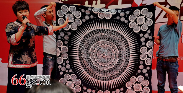 丹寨宁杭蜡染厂厂长宁曼丽在向观众介绍这幅“太阳鼓”蜡染作品图案的含义。