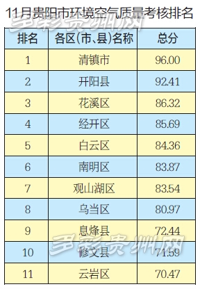 昨日,贵阳市11月空气质量考核结果出炉,清镇市在考核排名中列第一位,云岩区则排名垫底,另外,多个区县因大气污染防治不力,在考核中遭到扣分。