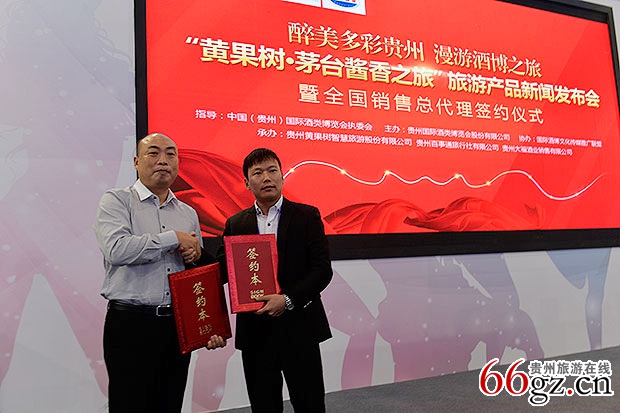 发布会上,黄果树智慧旅游股份有限公司与贵州百事通旅行社有限公司签署了《黄果树˙茅台酱香之旅》全国销售总代理协议。