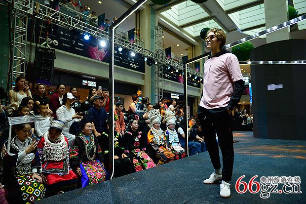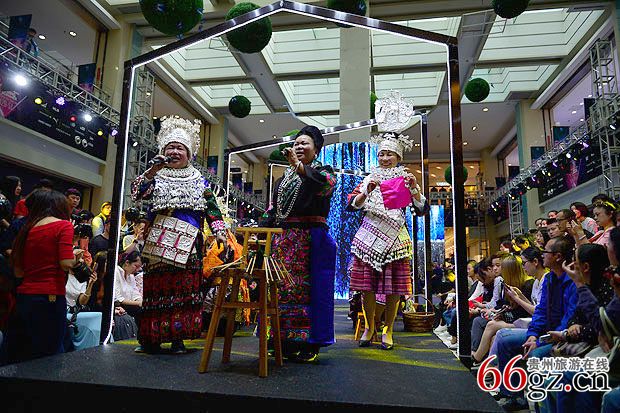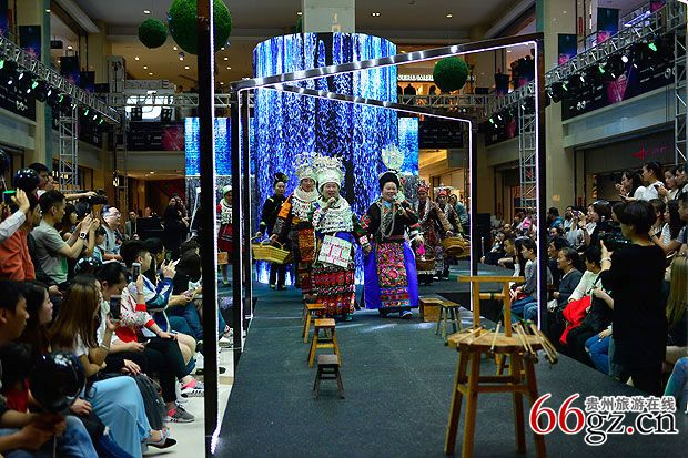 贵州旅游在线讯 5月1日,黔东南州台江县十二位身着民族盛装的苗族绣娘现身贵阳市亨特城市广场,助阵2017 Hunter S / S Fashion Show春夏时装秀发布会。为贵阳市民带来了一场时尚与传统碰撞的文化大餐。