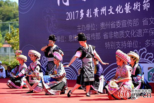 息烽民族服饰以青苗服饰最具特色主,服饰尚青,多姿多彩,其中未婚、已婚未生育和已婚生育子女的服饰各各有不同,制作方法采用传统手工刺绣制作而成;息烽花灯则是息烽县群众普遍喜爱的传统戏剧,内容包括流长推灯,养龙司荆江开脸花灯,九庄小调和折子灯等,一般在除夕到元宵期间演出,程序有出灯,开财门,参神,砍五方,合刀、打棍、土地,财神,逗幺妹,采茶,谢灯等,动作优美,唱腔多变;息烽阳戏是清乾隆时期就传承在息烽的传统戏剧。通过酬神还愿,达到请神还愿的目的,被称作戏剧的活化石,具有传承久远、幽默风趣的特点。