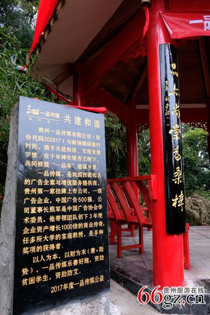 贵州一品传媒有限公司(股份代码202817)在两年前发现了风景秀丽、民风淳朴的保寨村,在村子里有一颗数千年古银杏树,古银杏依山而生,周围奇峰怪石,古树参天,山上有清泉流水常年不断,每到傍晚时分,农闲季节,村民们齐聚在古银杏树下谈天说地,甚是悠闲,特别是每年春季布依族同胞的“四月八”对歌会,更是有十里八乡自发组织的村民上万人聚集在古银杏树附近一起对歌,节日气氛好不热闹,春夏季节古银杏树及周围的参天古木就成了村民纳凉休闲、信息交流的好去处,到了秋季,全黄的银杏树叶挂满树头,撒满了一地金黄,有美丽的布依族姑娘从树下走过,犹如仙女一般,那历经数千年的美,让人叹为观止、美不胜收。但是由于偏僻,多少年来养在深闺人未识,基础设施落后,村民在此做活动时都是席地而坐,并时有摔伤的情况,一品传媒发现后,经过沟通,决定捐建上山步道,并在山脚古银杏树旁建“一品亭”供村民和游客歇息、观赏,在广褒的农村,“一品亭”虽小,但它是长在美丽乡村建设中的一朵小花,它的开放,预示着将引来百花盛开,一品传媒公司施惠于美丽乡村,是美美与共的美事,值得庆贺。