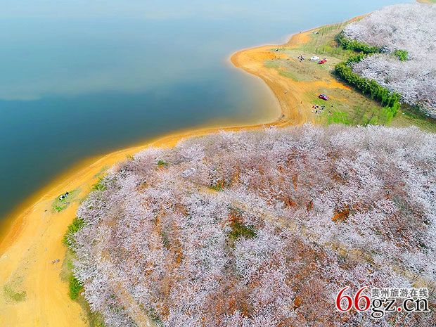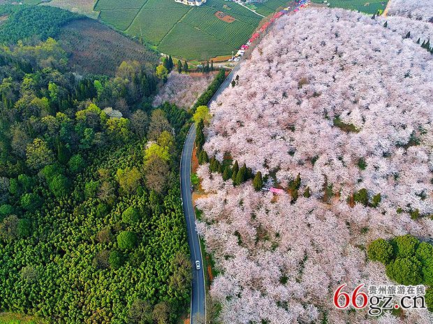 当日天气晴好,高空俯瞰万亩樱花十分壮观,令人心旷神怡。平坝农场坐落于高原明珠红枫湖畔,占地24000余亩,是贵州省最大的花卉苗木培育基地,每年春天樱花盛开,成为黔中大地的一大景观。